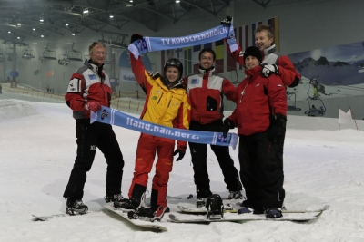 Beim sonntäglichen Snowboardfahren bewiesen einige der TVK-Jungs ungeahntes Talent. Da ist z.B. Dennis Marquardt, Rückraumspieler und in seiner zweiten Saison beim TV Korschenbroich. Obwohl das erste Mal auf einem Snowboard stehend, zeigte der 1,93m-Hüne überaus elegante Schwünge. „Es hat unheimlich viel Spaß gemacht, ich lag weniger auf der Nase als gedacht“, so der 23-Jährige. Angeleitet wurde Marquardt ebenso wie die anderen Beginner in Reihen des TVK von Snowboardlehrer "Kalle", der voll des Lobes war: "Die Jungs haben sich wirklich super angestellt, das erlebt man wirklich ganz selten. So macht das Arbeiten auch für mich Spaß, wenn eigentlich blutige Anfänger schon nach zwei Stunden den Hang hinunter fahren." Einzig Markus Breuer bildete eine Ausnahme: Der gebürtige Schwabe ist bereits ein erfahrener (Ski-) Hase und raste die Piste in gegenstoßähnlicher Geschwindigkeit herab. „Die Halle ist auch was für geübte Ski- und Snowboardfahrer“, urteilt Breuer, der als einziger eigenes Equipment mitgebracht hatte. Auch TVK-Rechtsaußen Mathias Deppisch zeigt sich begeistert: "Ein herzliches Dankeschön an die JEVER SKIHALLE Neuss für dieses tolle Erlebnis. Ich komme aus dem Norden und bin daher ohne Berge aufgewachsen. Ich hätte nicht gedacht, dass man so schnell zumindest die Grundzüge des Snowboardfahrens erlernen kann. Die Atmosphäre ist super und in der Gruppe macht so ein Tag doppelt Freude." Geschäftsführer Dr. Peter Irmen, der sich auch durch manch unsanfte Erfahrung mit dem Neusser Schnee nicht den Spaß verderben ließ, freute sich über einen gelungenen Tag im Kreise der TVK-Mannschaft. Bleibt zu hoffen, dass der TVK den Schwung aus der JEVER SKIHALLE Neuss mit in die nächsten Spiele nimmt… |
