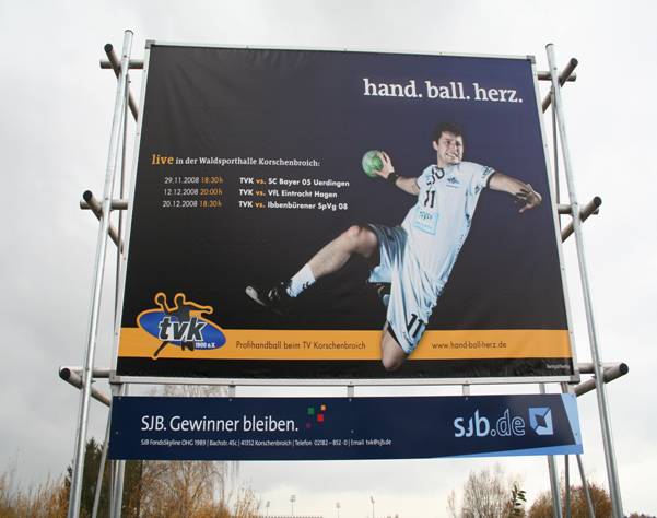 Der TVK forciert weiter seine Öffentlichkeitsarbeit: Nur einen Sprungwurf entfernt vom Borussia-Park der Fußballer schwebt überdimensional Marcel Görden. Der Junioren-Nationalspieler in Diensten des TVK ist Titelfigur eines sog. „Achtzehn-Eintel“-Plakats, auf dem die kommenden Heimspiele des TVK beworben werden. Auch das TVK-Motto „Hand.Ball.Herz“ soll in der Öffentlichkeit weiter an Bekanntheit gewinnen. „Marcel Görden musste bei dem Fototermin einiges an Ausdauer mitbringen, aber das Ergebnis kann sich sehen lassen“, freut sich der Marketingbeauftragte des TVK Kai Faltin. Ein herzliches Dankeschön an die Agentur „betty&betty“ sowie Edgar und Daniel Janzen von der Fa. „theartcompany“!