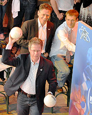 Steinmetz wirftIn bester Laune präsentierte sich das TVK-Team seinen Anhängern, Freunden und Familien am ‚Neußer Gletscher’. In einigen Talkrunden wurden auch die privaten Seiten der frisch gebackenen Zweitliga-Akteure beleuchtet – so wissen alle, die brav zugehört haben, jetzt auch Bescheid, wie Markus Breuer seinen 'Spätzle'-Nachschub bekommt, oder welche Spieler am fleißigsten bei Dennis Marquardt im Fitness-Studio sind. Zudem konnten nicht nur die jungen Fans ihr handballerisches Können beim Torwandwerfen beweisen.