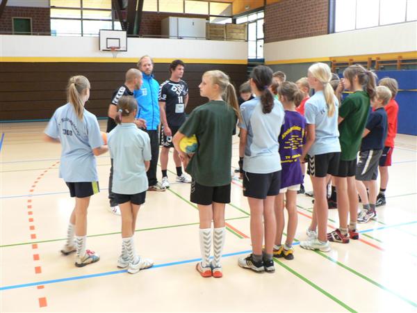 Gemeinsam erklärten und zeigten die TVK-Akteure der weiblichen und männlichen D-Jugend, worauf es beim Handball ankommt – Begeisterungsfähigkeit, Lernwille, Zielstrebigkeit, Trainingsfleiß, Spaß und ein Kämpferherz, eben hand.ball.herz. Die Mädchen und Jungs waren genauso begeistert wie "platt" von der 60minütigen Trainingseinheit.