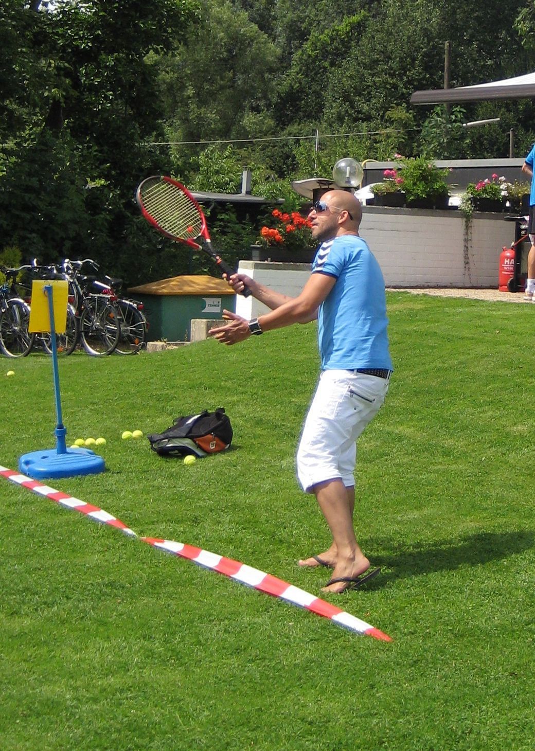 Dass Handballer meist über eine gehörige Portion Ballgefühl verfügen, zeigten die Spieler des TVK auf der Korschenbroicher Tennisanlage. Insbesondere bei den Geschicklichkeitsspielen zeigten sie ihr Können, auch wenn einige Akteure das erste Mal einen Tennissschläger in der Hand hielten. Im Vordergrund stand aber der Spaß – und der kam bei allen Beteiligten nicht zu kurz. Das lag zum einen an einem herrlichen Sommertag, der bei strahlend blauem Himmel angenehme Temperaturen bescherte. Aber auch die Organisatoren verdienten sich ein Extra-Lob. Allen voran Dieter Prüß, 1. Vorsitzender des KTC und langjähriger Sponsor des TVK in Personalunion, sorgte für einen reibungslosen Ablauf. Insgesamt 64 Teilnehmer waren am Start – fast immer im Mixed und überwiegend in der Kombination TVK und KTC. Gewertet wurden Weitschlagen von der Terrasse aus, Geschwindigkeitsmessen beim Aufschlag, aber auch skurille Disziplinen wie Eimertennis, Basketballkorb-Zielen (auf dem Foto rechts versucht sich TVK-Trainer Khalid Khan)und Beachball-Tennis. TVK-Spielmacher Simon Breuer gewann mit seiner Partnerin Petra hauchdünn die Gesamtwertung, dank des Finalsieges auf dem Centre Court im „Beachball-Tennis“, der für regelrechte Beifallsstürme bei den Zuschauern auf der Terrasse sorgte.