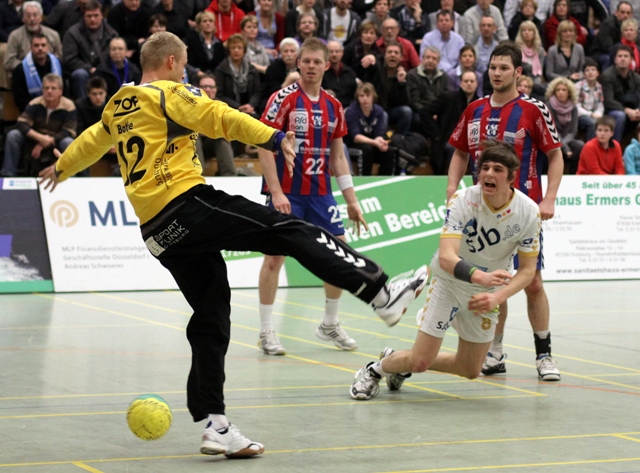 „Der OSC wird bis zum Ende kämpfen. Wir müssen weiter konzentriert bleiben!“, mahnte Khalid Khan zur Halbzeit. Er sollte recht behalten: Beim spektakulären 27:20 (48. Minute) durch Marcel Görden nach langem Pass von Torwart Oliver Mayer schien das Spiel gelaufen. Doch Rheinhausen stellte auf doppelte Manndeckung gegen die Breuer-Brüder um und biss sich noch einmal zurück in die Partie. In der entscheidenden Phase – der OSC hatte vier Minuten vor Ultimo bis auf zwei Tore verkürzt – spielte der TVK seine Klasse aus und siegte verdient. Die Revanche für die überraschende Hinspielniederlage war somit gelungen und die momentanen Kräfteverhältnisse am Niederrhein wurden wieder gerade gerückt.