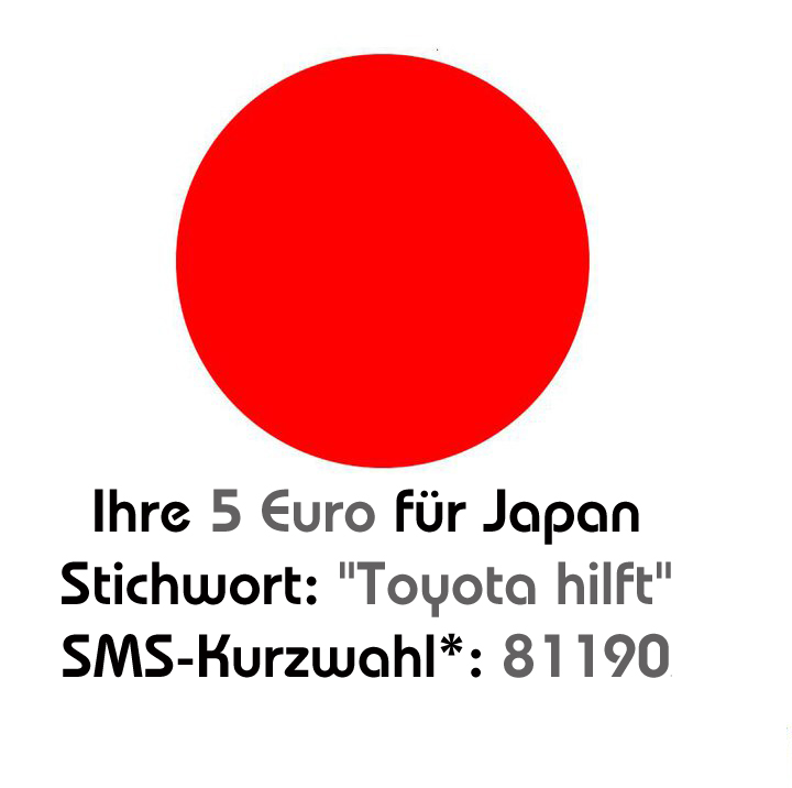 Mit einer Schweigeminute zu Beginn des Spiels gegen Aue, am vergangenen Dienstagabend, haben Zuschauer und Mannschaften bereits den erschütternden Ereignissen in Japan gedacht. In Anbetracht der schrecklichen Geschehnisse hat TOYOTA Deutschland unter dem Motto „Ihre 5 Euro für Japan" alle Fans und die Vereine der TOYOTA Handball-Bundesliga zur Unterstützung aufgerufen. Jeder aus der Handballfamilie kann ab sofort eine SMS mit „Toyota hilft“ an die Nummer 81190 senden.