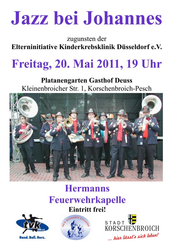Jazz bei JohannesLos geht es schon am Freitagabend. Dann steigt nämlich im Platanengarten der Gaststätte Deuss (Kleinenbroicher Straße in Pesch) um 19 Uhr zum 20. Mal „Jazz bei Johannes“. An der wohltätigen Veranstaltung zugunsten der Elterninitiative Kinderkrebsklinik Düsseldorf werden auch zwei bekannte TVK-Gesichter teilnehmen: Rechtsaußen Mathias Deppisch und Marketingmanager Kai Faltin freuen sich schon jetzt auf Jazz von „Herrmanns Feuerwehrkapelle“ aus Mönchengladbach. Zusätzlich hat der TVK drei exklusive Fan-Pakete geschnürt, die an diesem Abend versteigert werden sollen. Inhalt dieser Pakete sind jeweils 2 Eintrittskarten, ein Trikot, ein Fan-Schal und ein signierter Handball. „Ehrensache, dass wir diese traditionsreiche Wohltätigkeitsveranstaltung unterstützen. In der Vergangenheit haben die Korschenbroicher mehrfach unter Beweis gestellt, dass sie ein großes Herz haben und es sich nicht nehmen lassen, für den guten Zweck auch mal tiefer in die Tasche zu greifen. Ich würde mich freuen, wenn wir mit unseren drei exklusiven Fan-Paketen einmal mehr eine stattliche Summe zusammen bekommen, um sie dann der Elterninitiative Kinderkrebsklinik Düsseldorf zur Verfügung stellen zu können“, kommentiert Faltin den Beitrag des TVK zum Gelingen der Veranstaltung, zu der der Eintritt übrigens frei ist.