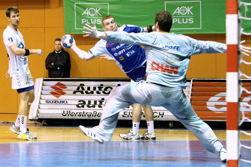 Marcel Görden EisenachDen Beginn der zweiten Halbzeit prägten vor allem die beiden Torhüter. Hatte Radek Musil im Eisenacher Gehäuse in Durchgang eins noch bei der Anzahl der Paraden im Duell mit Oliver Mayer die Nase vorn gehabt, bestätigte der Keeper des TVK in der zweiten Halbzeit, seine bestechende Form aus den letzten Partien. Auf jede Parade Musils folgte unmittelbar eine von Mayer, das Spiel wogte hin und her. Weil aber Oli Mayer mit zunehmender Spieldauer das Duell der beiden Torhüter mehr und mehr für sich entschied, gelang es seinen Vorderleuten den zwischenzeitlichen Vorsprung von drei Treffern (18:15, 37.) bis zur 42. Minute zu egalisieren (20:20, Fuchs).