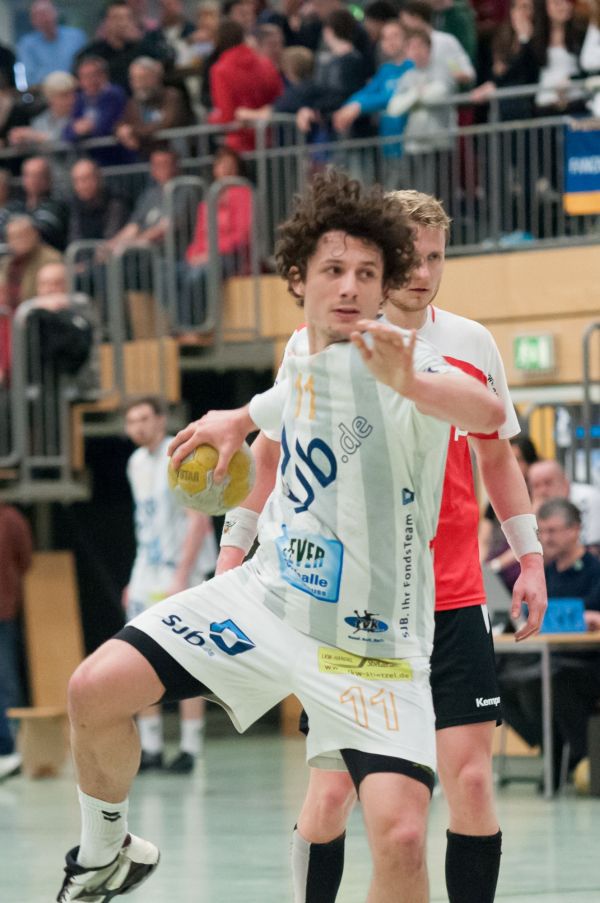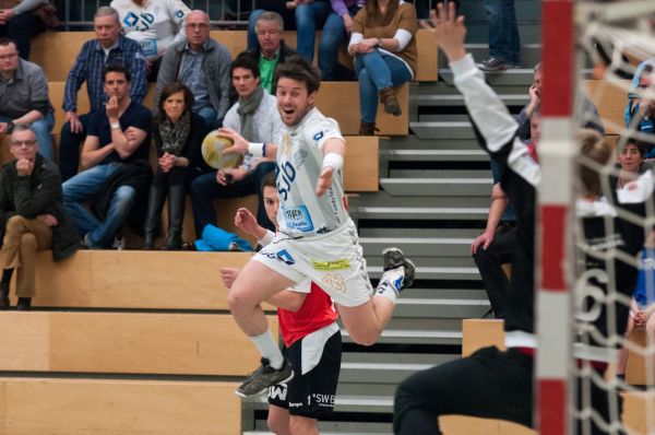 Nur drei Minuten später verkürzte Marcel Görden vom Siebenmeterpunkt bereits zum 4:6. Verbissen kämpften die Voß-Schützlinge fortan um jeden Ball, suchten noch in den ausweglosesten Situationen den Weg zum Tor und waren dabei oftmals auch erfolgreich. Parallel dazu steigerte sich auch Oliver Mayer im Korschenbroicher Kasten und entschärfte einige Großchancen. So war er es dann auch, der in der 23. Minute mit einem gehaltenen Siebenmeter gegen Nico Kibat Simon Breuer die Gelegenheit ermöglichte, mit dem 11:11 erstmals auszugleichen. Zwar rettete sich die SG durch einen zum 13:14 verwandelten Strafwurf bei bereits abgelaufener Uhr noch eine knappe Führung in die Halbzeitpause, die Ausgangslage für Durchgang zwei war aber völlig offen.