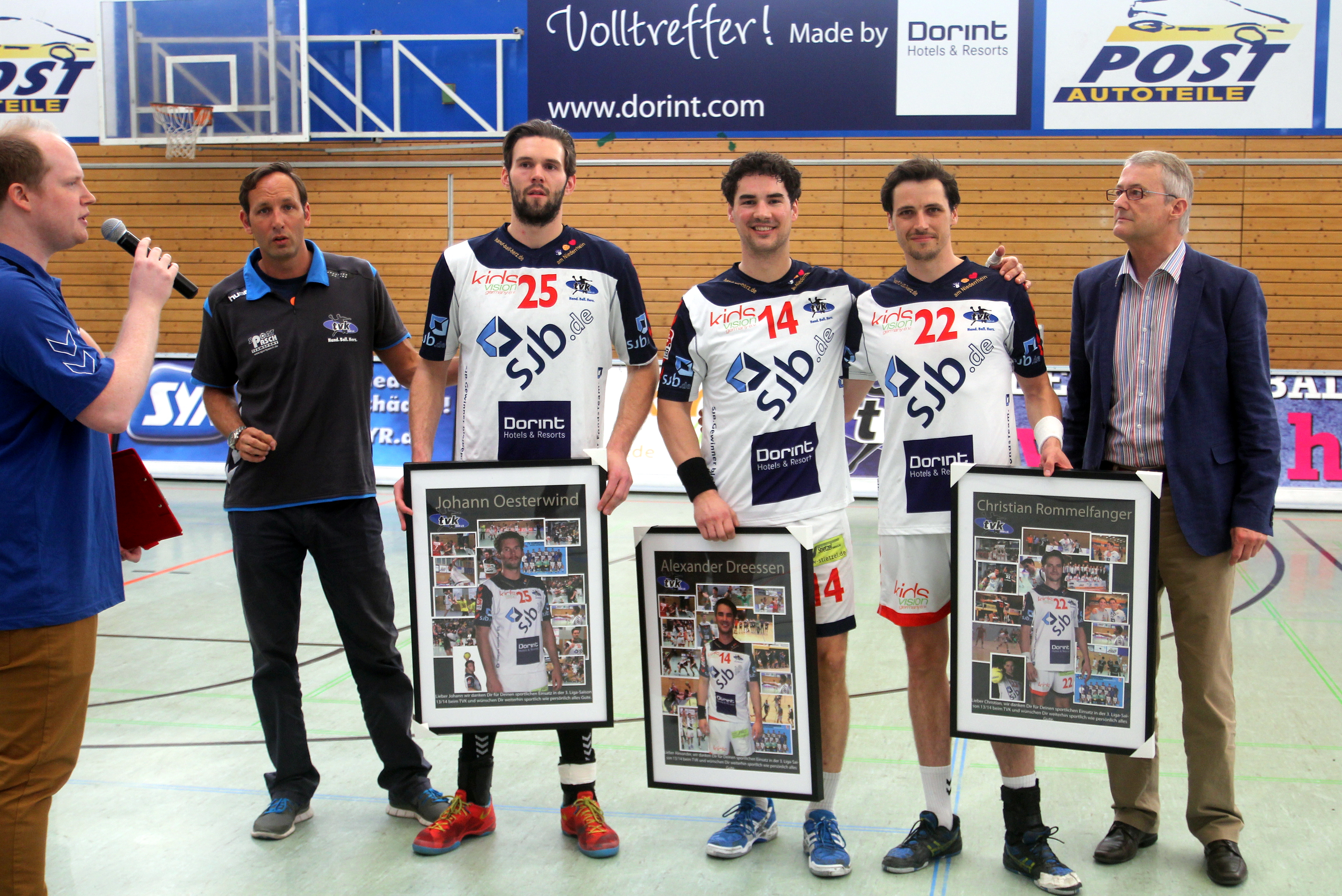 Peter Irmen, Geschäftsführer, und Kai Faltin, Manager und Sportlicher Leiter, nahmen die Verabschiedungen der drei Spieler vor. Das Trio erhielt jeweils als Dankeschön einen großen Bilderrahmen mit einer Bilderkollage überreicht. Nach dem Spiel interviewte Hallensprecher Sebastian Raab, der wieder einen tollen Job in dieser Spielzeit machte, Oesterwind, Dreessen und Rommelfanger noch einmal.