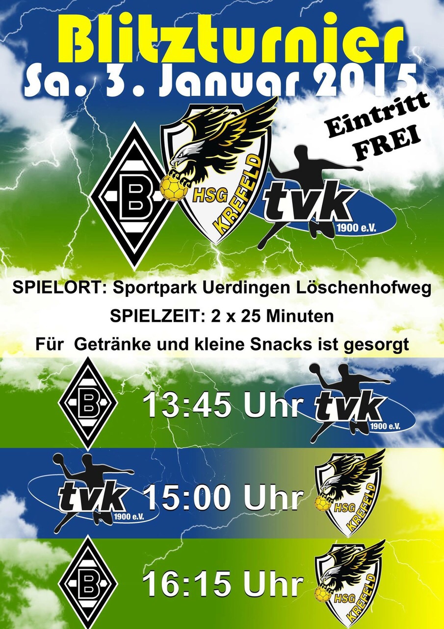 Bereits am Samstag nimmt der TV Korschenbroich an einem Blitzturnier bei der HSG Krefeld teil. Neben den beiden Drittligisten ist Oberligist Borussia Mönchengladbach ebenfalls am Start. Um 13.45 Uhr startet das Turnier, bei dem eine Spielzeit von 2 x 25 Minuten festgelegt wurde, mit der Partie zwischen Borussia Mönchengladbach und dem TV Korschenbroich. Um 15 Uhr bestreitet das Hand.Ball.Herz.-Team bereits sein zweites Spiel und trifft im Sportpark auf die HSG Krefeld. Um 16.15 Uhr trifft Borussia Mönchengladbach auf die HSG Krefeld. Der Eintritt bei diesem Blitzturnier ist frei.