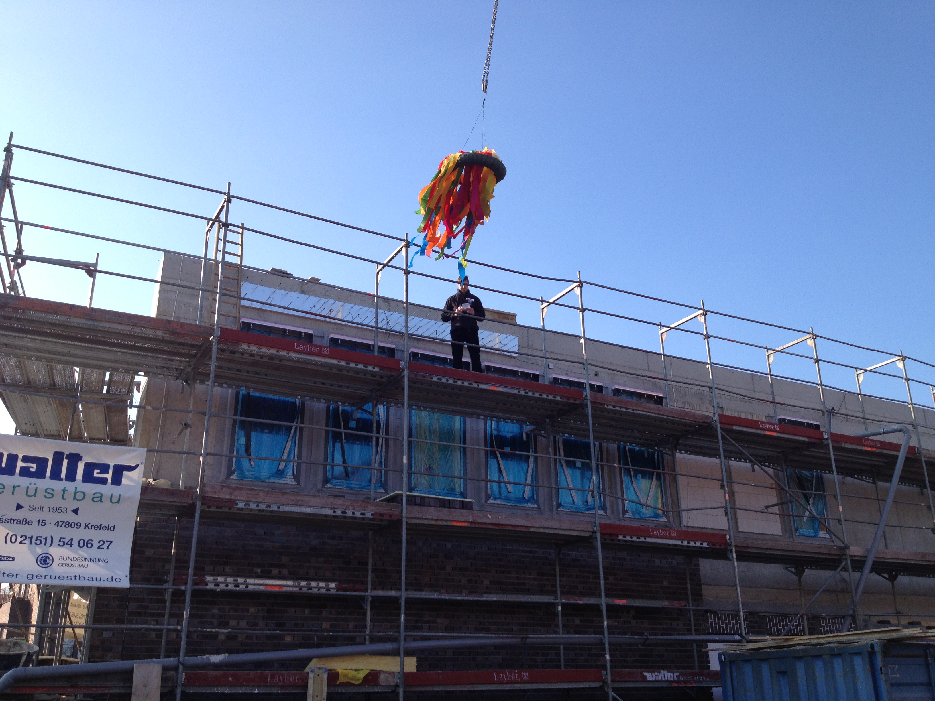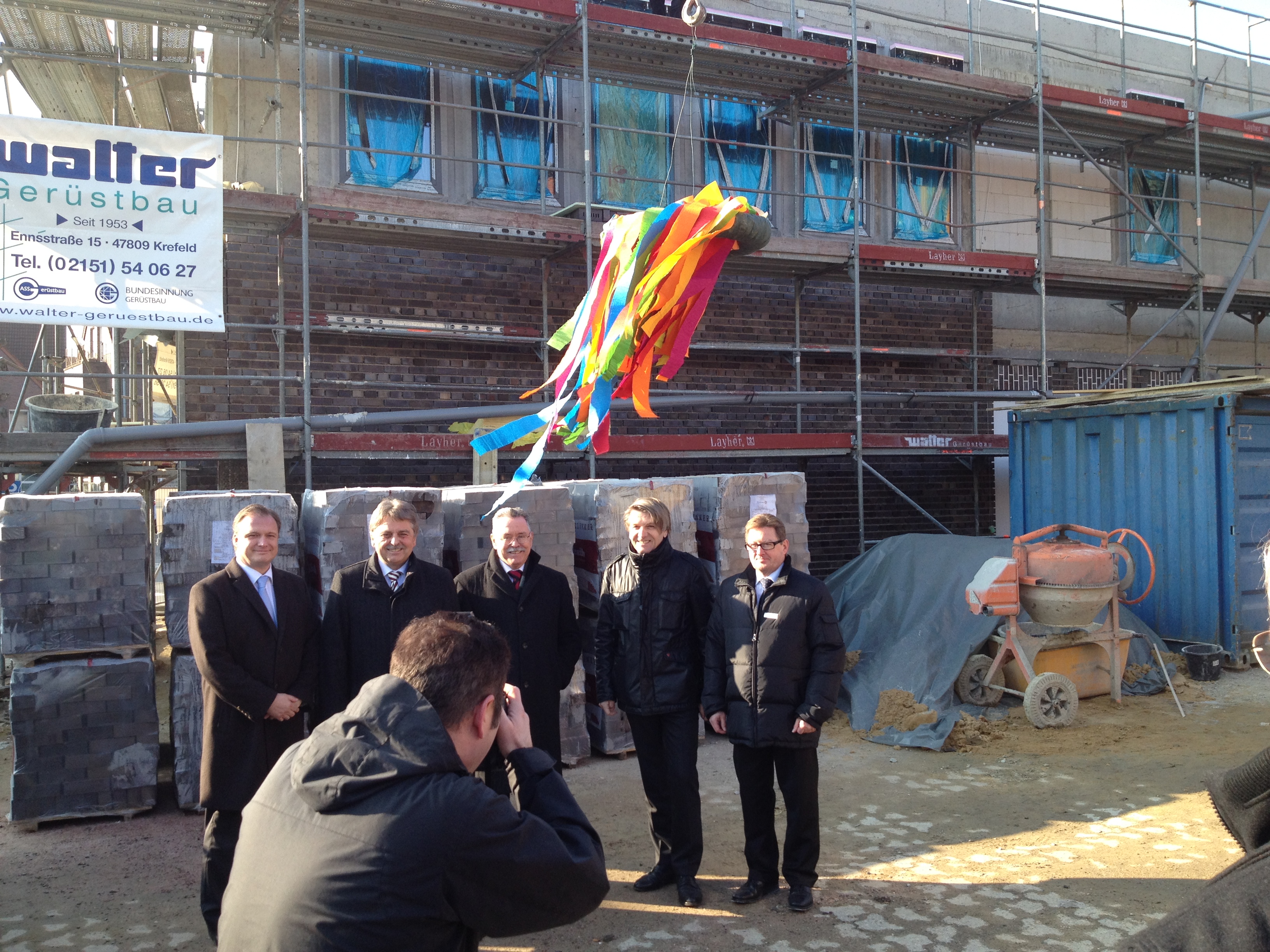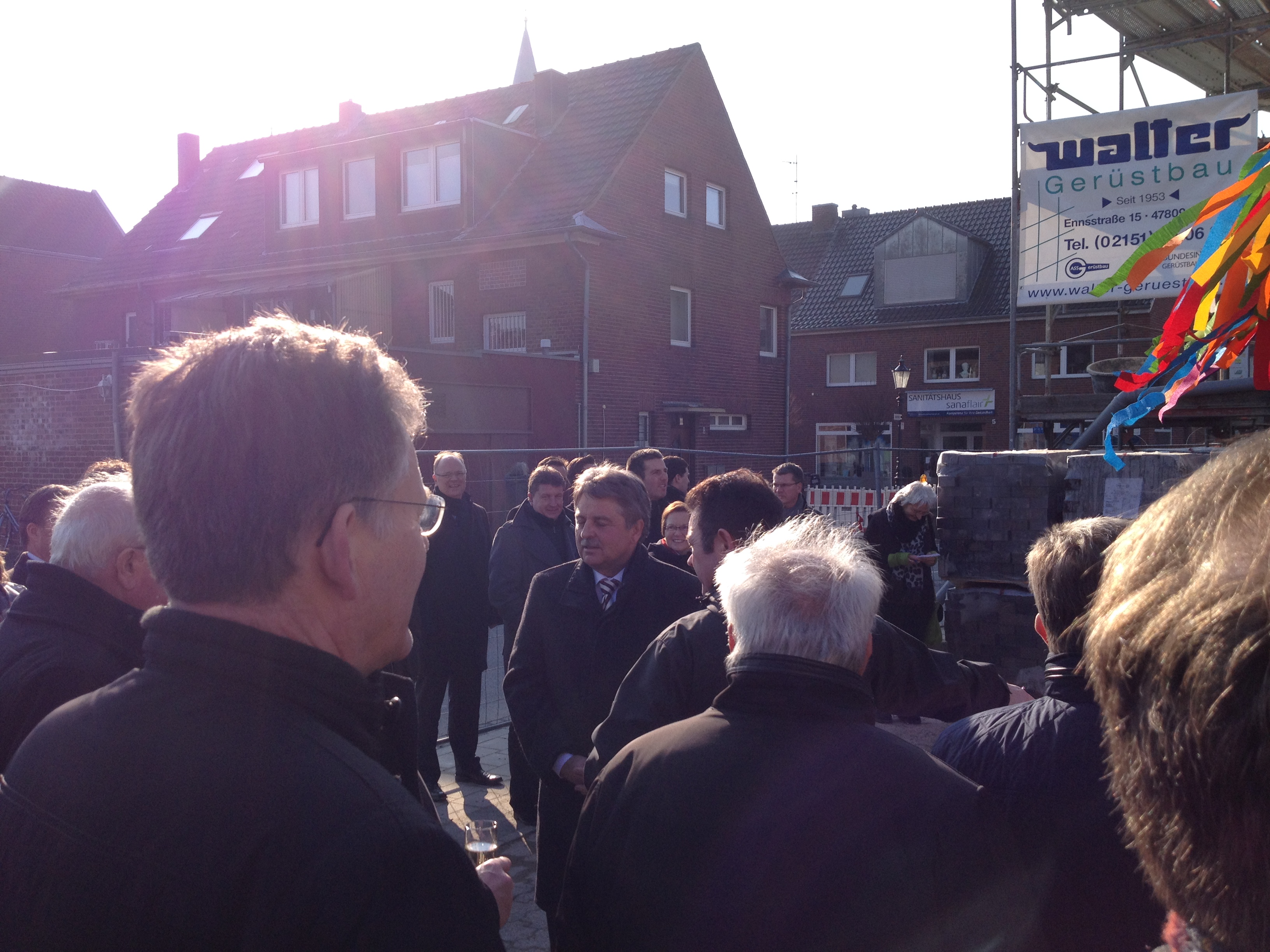 Auch Kai Faltin, Sportlicher Leiter und Manager des TV Korschenbroich, und Peter Irmen, Geschäftsführer des TV Korschenbroich, waren beim Richtfest der Gladbacher Bank in Korschenbroich vor Ort. Sie waren zwei von rund sechzig Gästen, die sich vor Ort ein Bild von dem Neubau an der Hindenburgstraße/Ecke Arndtstraße machen wollten. Unter anderem war auch Korschenbroichs Bürgermeister Heinz Josef Dick unter den Gästen.