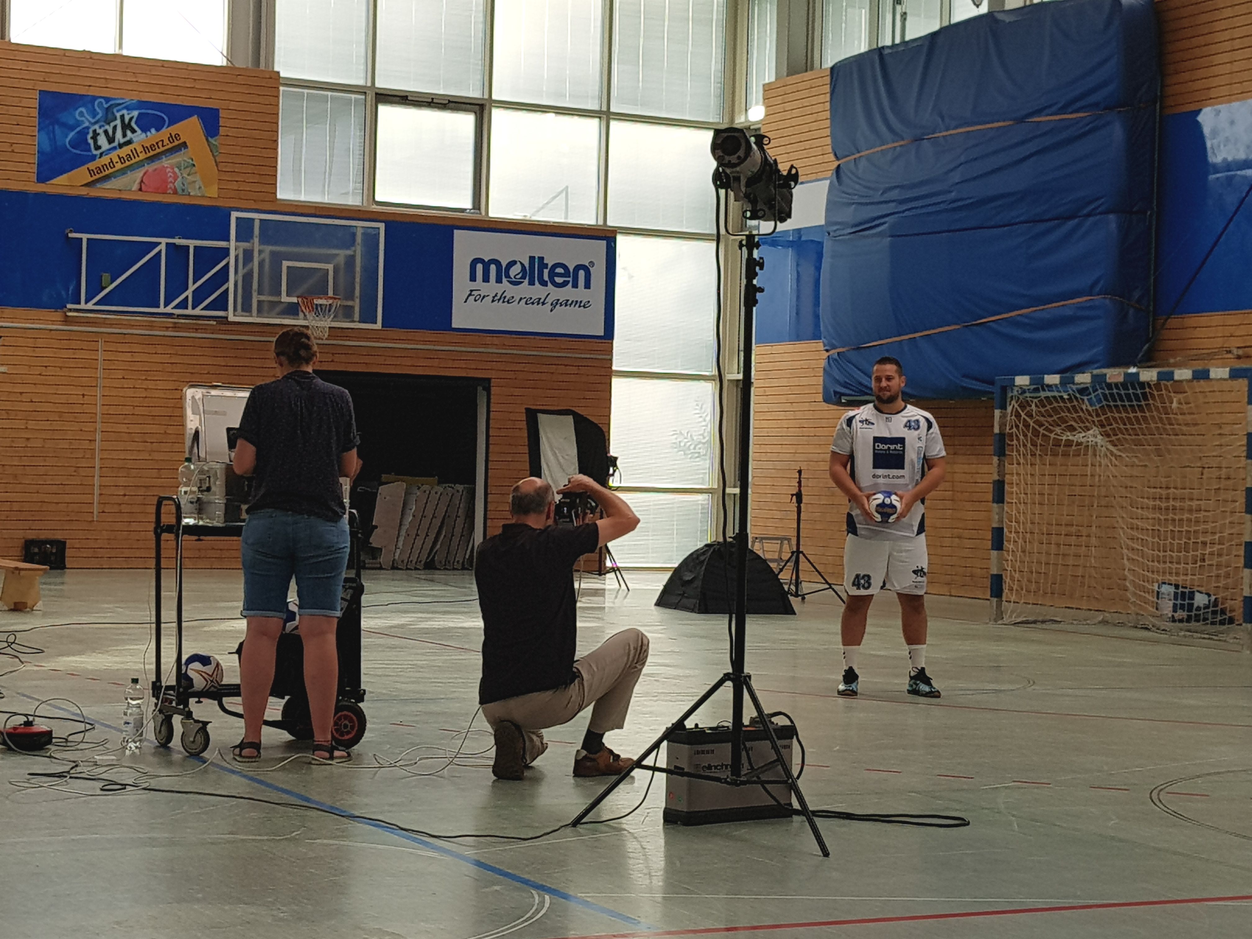 Seit Jahren ist es beim TV Korschenbroich Usus, dass an einem Tag in der Vorbereitung das offizielle Fotoshooting stattfindet. Am Montagabend war es wieder soweit: Ein professionelles Team mit drei Mitarbeitern kam, baute ihr Equipment auf und verwandelte die Waldsporthalle zu einem großen Fotostudio. Zudem waren auch die TVK-Partner Mizuno und das Sanitätshaus Renovatio vor Ort.
