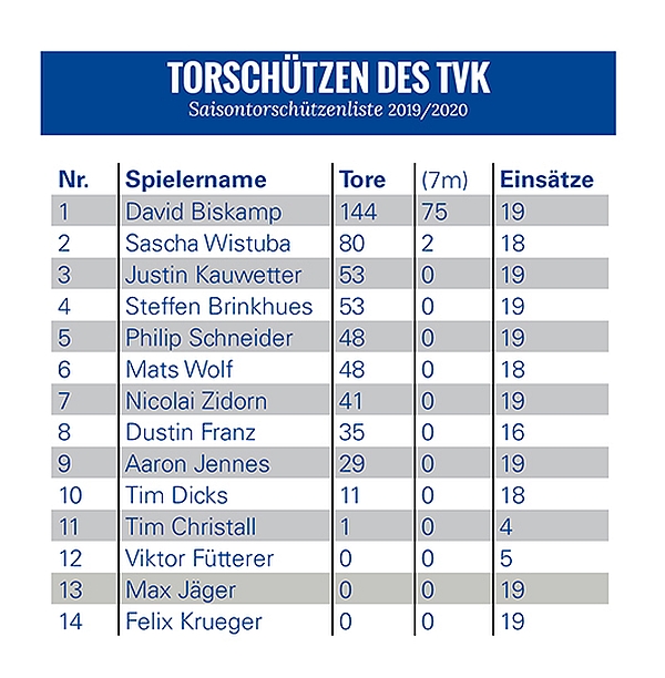 Nachdem die Saison 2019/20 leider schon vorüber ist, möchten wir euch auch die abschließende Torschützenliste unseres TVK präsentieren. Bester Torschütze war David Biskamp mit insgesamt 144 Treffern. Ligaweit belegt David damit den 2. Platz hinter Alexander Oelze (SG Ratingen).