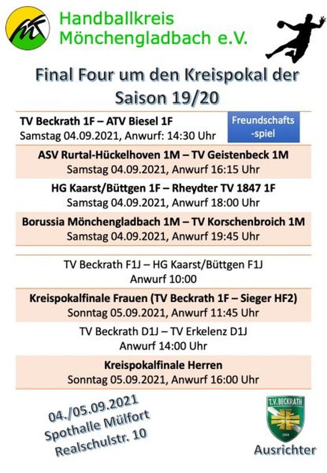 Am Wochenende 4./5. September findet coronabedingt mit anderthalbjähriger Verspätung das Final Four des Handballkreises Saison 2019/20 statt. Der Austragungsort ist diesmal nicht die Jahnhalle, sondern erstmalig die Halle Mülfort (Realschulstrasse 10) in der die jeweils 4 Halbfinalisten der Frauen und Männer am Samstag die Endspielteams für Sonntag ermitteln.
