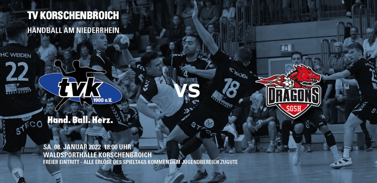 Die Meisterschaft in der Regionalliga Nordrhein ruht noch am kommenden Wochenende. Dennoch haben die Verantwortlichen gleich zu Beginn des Jahres 2022 ein echtes Highlight organisieren können. Am Samstag, den 8. Januar 2022 um 18.00 Uhr trifft das Hand.Ball.Herz-Team in eigener Halle im Rahmen eines Freundschaftsspiels auf den aktuellen Tabellenführer der 3. Liga Staffel D, die SGSH Dragons.