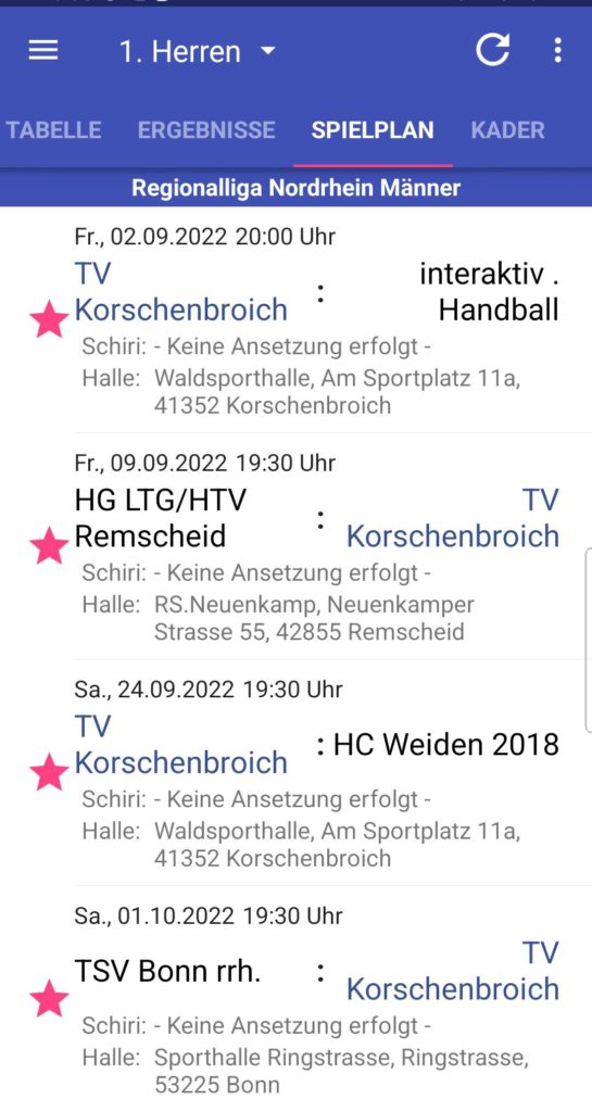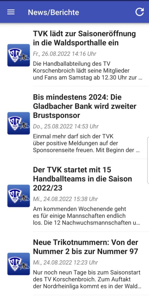 In der TVK-App erhältst Du Infos (Berichte, Tabellen, Spieltermine) über alle 15 TVK-Teams der Saison 2022/23 und natürlich mit Spielbeginn auch Zugriff auf den jeweiligen Liveticker nicht nur der 1. Herrenmannschaft (wenn die Heimmannschaft ihn anbietet).