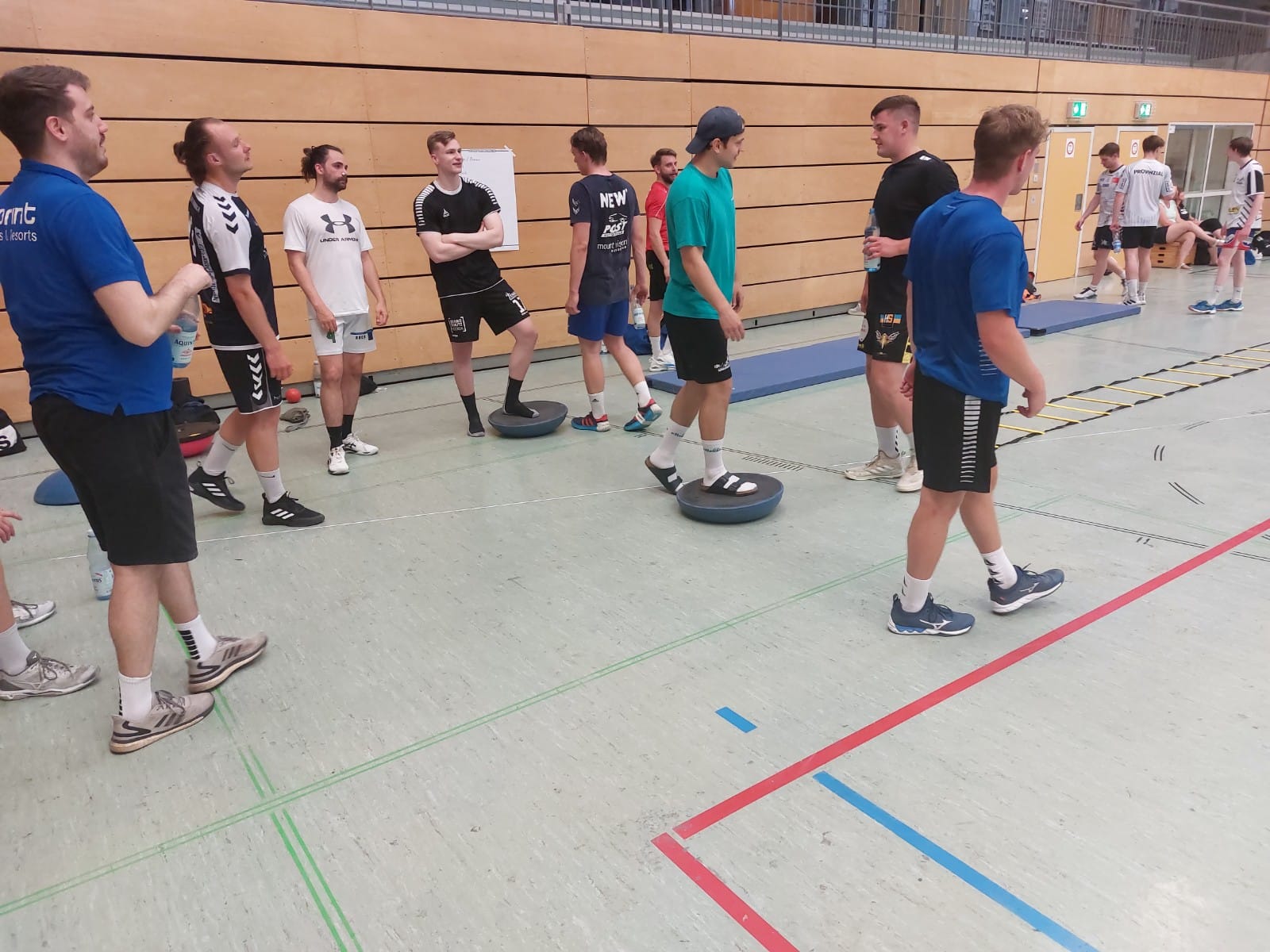 Klaus Weyerbrock und Gilbert Lansen begrüßten die Spieler des TV Korschenbroich im Besprechungsraum der Waldsporthalle. Anschließend gab es einen kurzen Informationsaustausch. Dreißig Minuten später standen die Akteure des hand.ball.herz.-Team dann gemeinsam mit der 2. Mannschaft auf dem Spielfeld der Waldsporthalle, die erste Trainingseinheit der Saison 2023/2024 hatte begonnen.