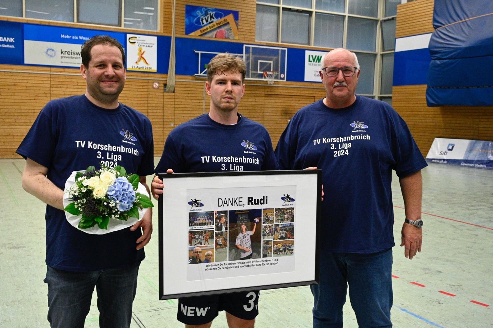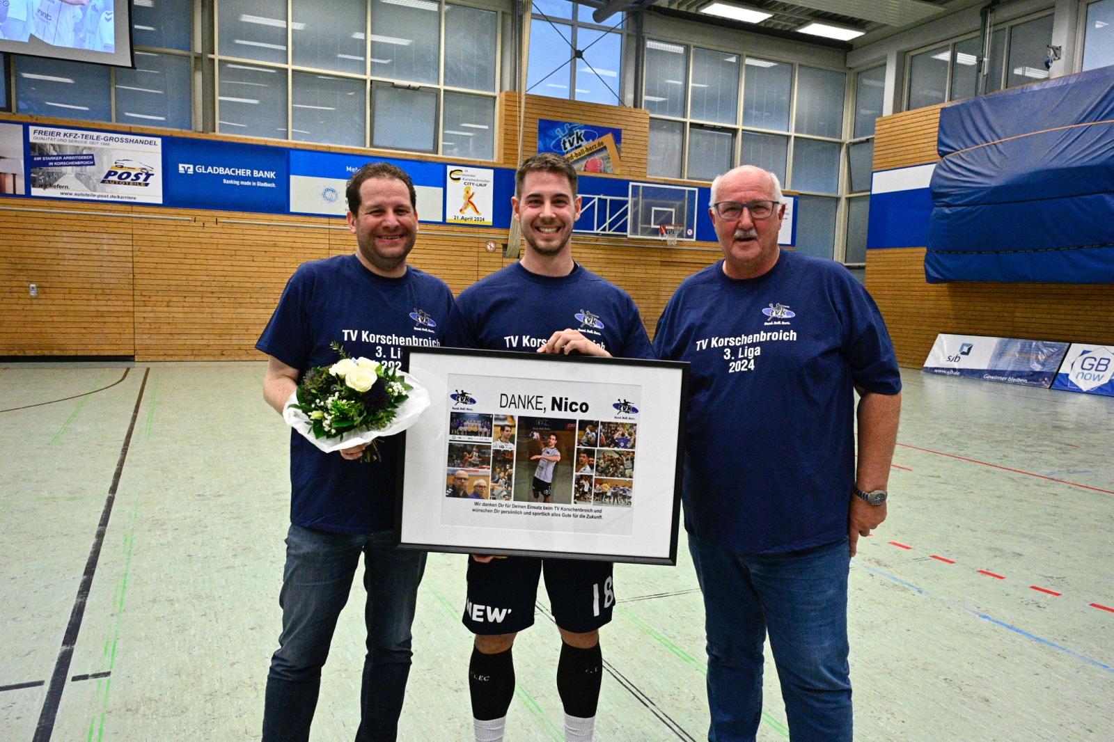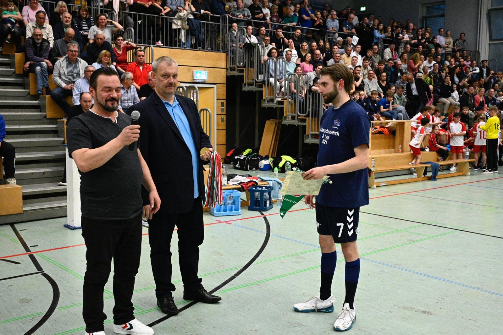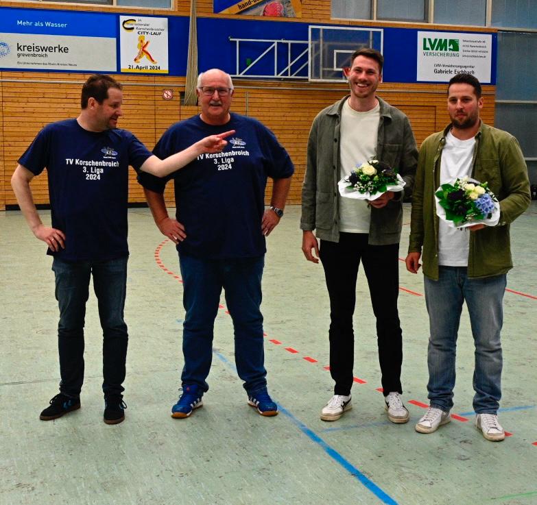 Der TV Korschenbroich hat am Samstagabend sechs Spieler und Dirk Wolf verabschiedet. Zudem gab es ein Dankeschön an Keeper Max Jäger und Kreisläufer Philip Schneider, die sich in dieser Saison noch einmal in den Dienst des Vereins stellten und in der ersten Mannschaft aushalfen. Von den über 700 Zuschauern in der ausverkauften Waldsporthalle gab es tosenden Applaus für das Sextett, den scheidenden Coach und die beiden ehemaligen Akteure.