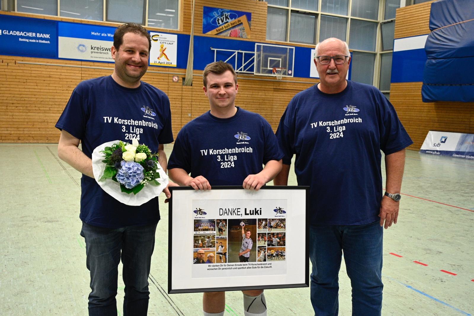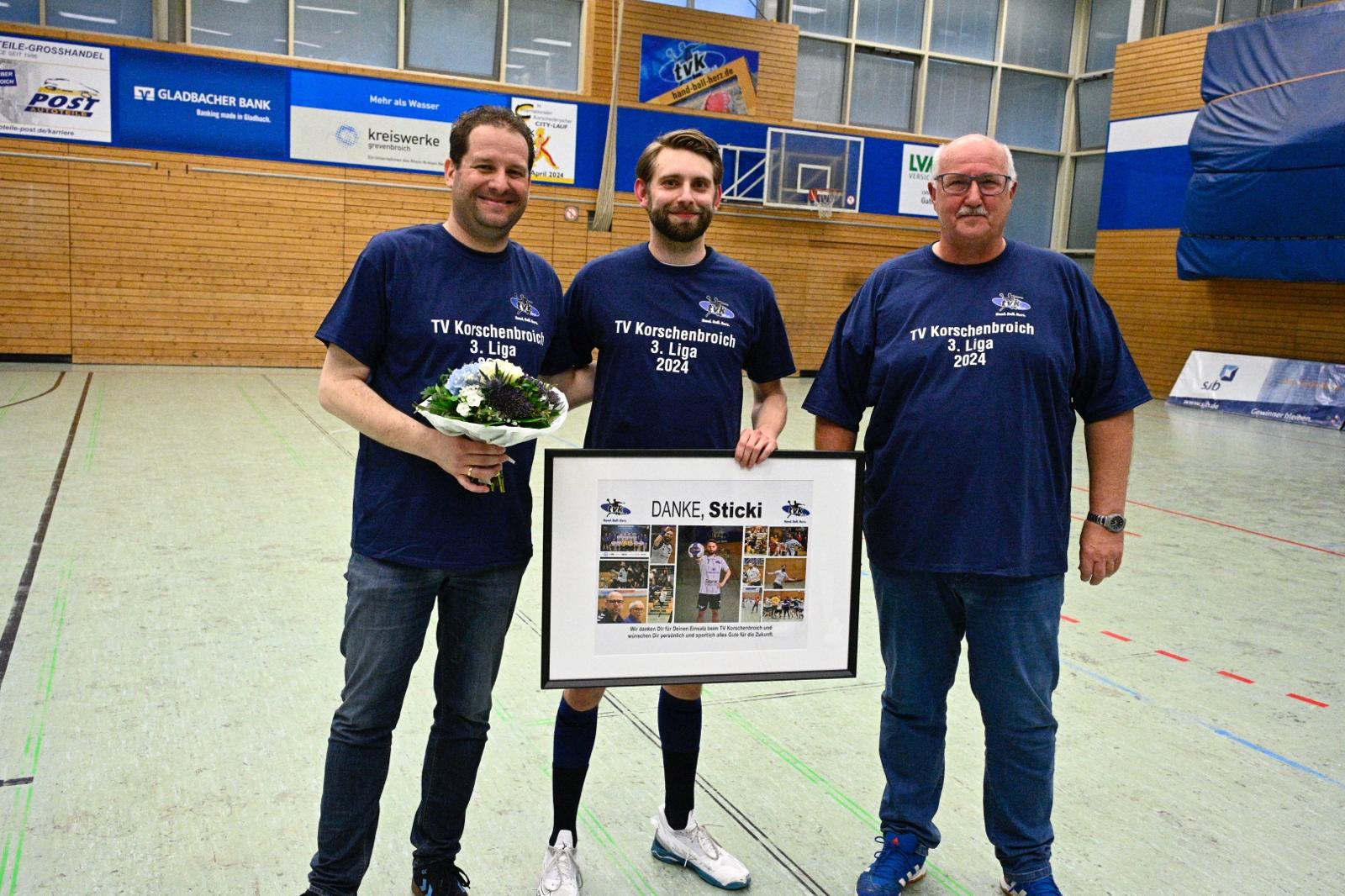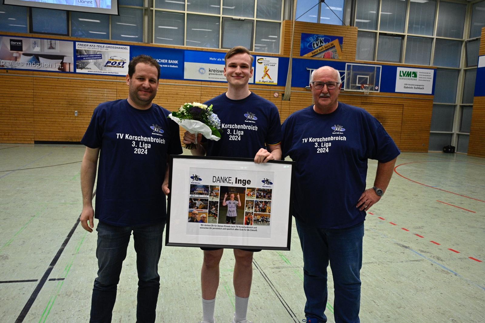Der TV Korschenbroich hat am Samstagabend sechs Spieler und Dirk Wolf verabschiedet. Zudem gab es ein Dankeschön an Keeper Max Jäger und Kreisläufer Philip Schneider, die sich in dieser Saison noch einmal in den Dienst des Vereins stellten und in der ersten Mannschaft aushalfen. Von den über 700 Zuschauern in der ausverkauften Waldsporthalle gab es tosenden Applaus für das Sextett, den scheidenden Coach und die beiden ehemaligen Akteure.