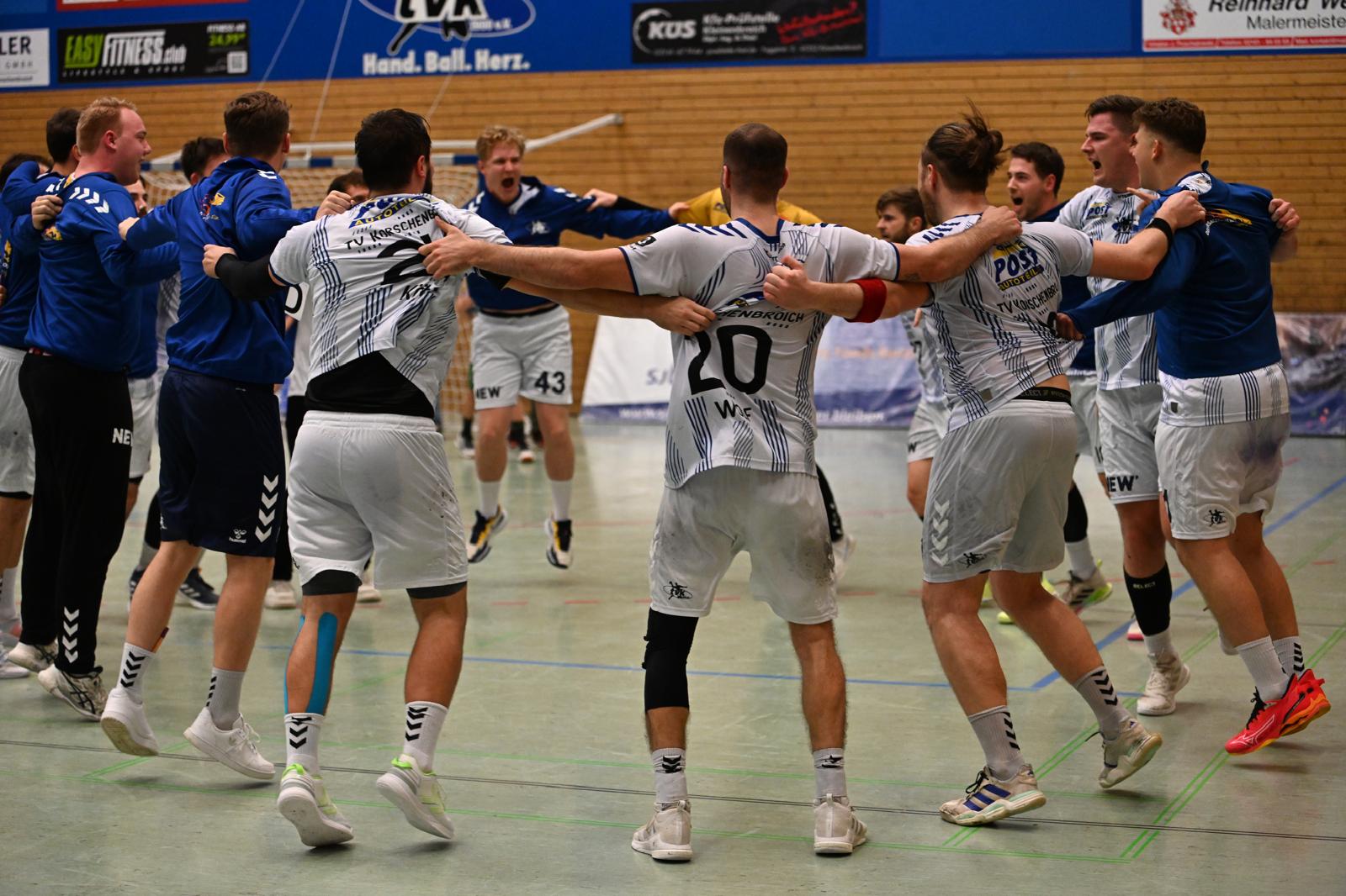 In Halbzeit zwei kämpfte sich der TVK zurück – und das aus einer starken Deckung mit einem weiterhin bestens aufgelegten Felix Krüger im Kasten. In der 39. Minute erzielte Steffen Brinkhues, der insgesamt fünfmal erfolgreich war, den Treffer zum 17:18. Doch erneut konnten sich die Gäste auf 21:17 absetzen, der TVK ließ zu viele Chancen liegen und leistete sich immer wieder den einen oder anderen technischen Fehler. Zehn Minuten vor dem Spielende lag das hand.ball.herz.-Team noch mit 20:23 zurück. Doch was dann folgte war ein furioses Finale im Kellerduell. Ein Doppelschlag von Til Klause sowie ein weiterer Treffer von Max Eugler sorgten bis zur 54. Minute für den 23:23-Ausgleich. Der Treffer von Mats Wolf, der mit sieben Treffer erfolgreichster Feldtorschütze der Partie war, löste in der Waldsporthalle einen emotionalen Freudenausbruch aus. 4 ½ Minuten vor dem Spielende lag der TVK erstmals wieder in Führung, 24:23 hieß es zu diesem Zeitpunkt. Die letzte Führung datierte aus der 9. Minute durch den erfolgreichsten TVK-Schützen Max Zimmermann, der insgesamt acht Treffer erzielte. Der Rückkehrer erzielte durch einen verwandelten Siebenmeter das 6:5. Und der Linksaußen und Kapitän netzte in der 58. Minute erneut ein und erzielte den Treffer zum 25:23. Die Panther kamen noch einmal auf 24:25 heran, doch Frank Berblinger zog 44 Sekunden vor dem Spielende noch einmal die grüne Karte, besprach sich mit den Jungs. Und Mats Wolf sorgte 16 Sekunden später für die endgültige Entscheidung, er traf zum 26:24. Die Korschenbroicher Waldsporthalle war zu diesem Zeitpunkt längst ein Tollhaus und bebte entsprechend. Am Ende feierte das hand.ball.herz.-Team mit dem 26:24-Erfolg über die Panther den zweiten Sieg in der Spielzeit 2024/2025.