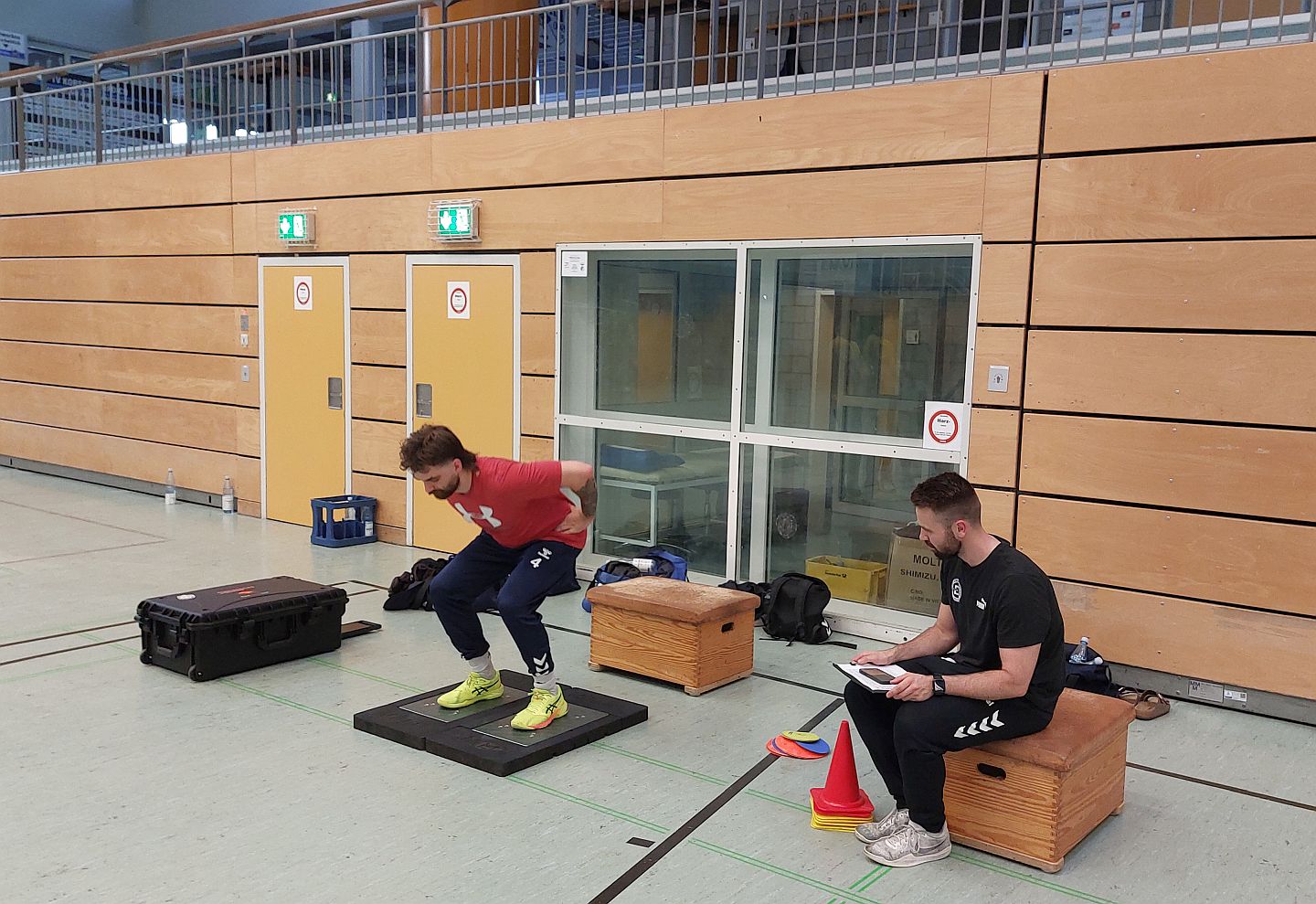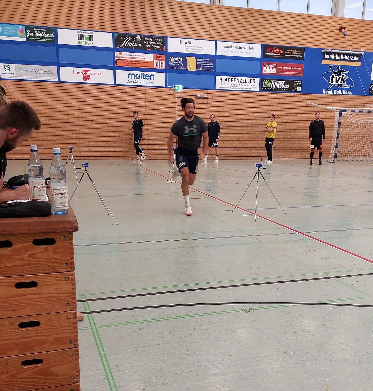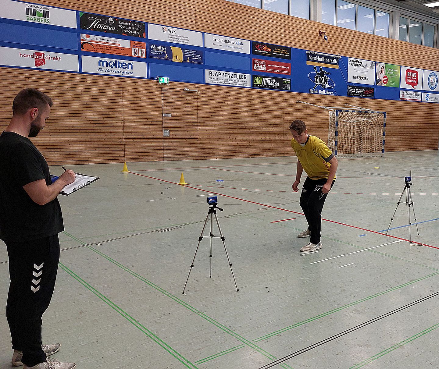 Unter Anleitung von Nils Haller und Tanja Berblinger von Plus D Sports aus Solingen wurden mit Hilfe von u.a. 8 Kameras, einer Kraftmessplatte und weiteren Sportgeräten eine Schnelligkeit-, Sprungkraft- und Ausdauerdiagnostik durchgeführt.