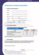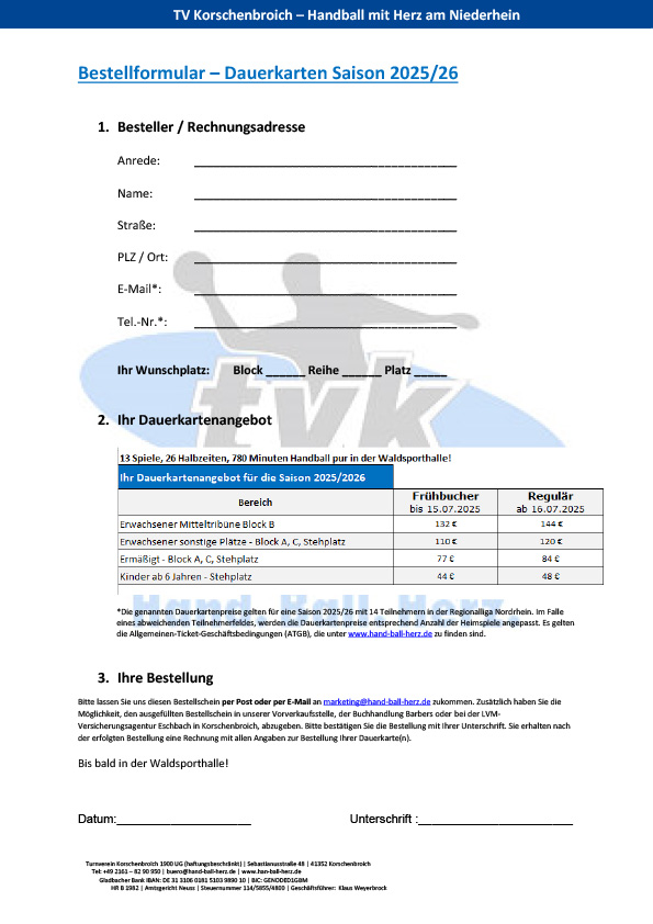 Bitte lassen Sie uns den auf dieser Seite bereitgestellten Bestellschein per Post, unter 02161/4755257 oder per E-Mail an marketing@hand-ball-herz.de zukommen. Bitte bestätigen Sie die Bestellung mit Ihrer Unterschrift. Sie erhalten nach der erfolgten Bestellung eine schriftliche Bestätigung mit allen Angaben zur Abholung und Bezahlung Ihrer persönlichen Dauerkarte.